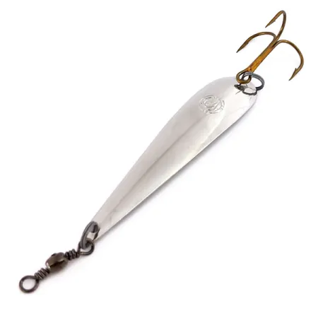Ryški nikelio danga suteikia šiai 9 cm (3 1/2") Panther Martin Alborella Verbano Tirlindada blizgei itin atspindintį profilį, kuris yra esminis žvejojant gilesniuose vandenyse. Šis Italijoje pagamintas, specialiai velkiavimui skirtas masalas sveria 11 g (2/5 oz) ir yra kruopščiai suformuotas taip, kad imituotų lieknas pašarines žuveles, aptinkamas Verbano regione. Produktas, kurio kodas 12237, yra nenaudotas, o už švarią originalią būklę jam suteiktas 6 balų įvertinimas. Komplektacijoje yra tvirtas trišakis kablys uodegoje ir integruotas statinis suktukas priekyje, skirtas valo sukimuisi suvaldyti ilgų velkiavimo sesijų metu. Gamintojo spaudas aiškiai matomas ant išgaubtos lapelio pusės, patvirtinantis blizgės vintage kilmę.
