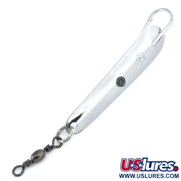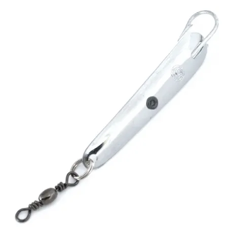 Ši Italijoje pagaminta grakšti nikelio apdailos vartiklė yra lygiai 6cm (2 1/4") ilgio. Panther Martin Cheppia con Amo yra specializuotas metalinis masalas, pasižymintis išskirtiniu vienšakio kablio dizainu, kur kablys pritvirtintas tiesiai prie poliruoto korpuso. Šis konkretus egzempliorius, pažymėtas prekės kodu 10874, yra nenaudotas. 5,5g (3/16oz) svoris yra sutelktas tolimiems metimams arba vertikaliam pateikimui. Korpuso centre yra nedidelis juodas apskritas elementas, suteikiantis subtilų kontrastą blizgiam paviršiui. Masalo kilpelė sukomplektuota su tvirtu žiedeliu ir juodintu sukučiu, kad traukiant masalą nesusisuktų valas. Ikoniškas Panther Martin logotipas yra aiškiai įspaustas nikelio dangoje prie kablio.
