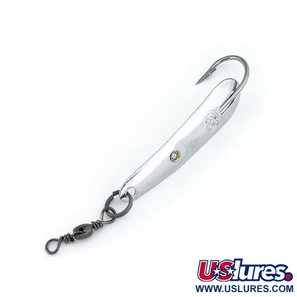 Nikelio danga suteikia veidrodinį spindesį šiam 3,5g (1/8oz) Panther Martin Cheppia con Amo modeliui. Kilęs iš Italijos, šis specifinis modelis (produkto kodas: 10875) pasižymi aptakiu dizainu, dažnai naudojamu pergalės silkių ar lengvai sūrių vandenų žuvų žūklei. Vienšakis kablys unikaliai pritvirtintas prie poliruoto korpuso tvirta kniede – tai konstrukcinė detalė, išskirianti jį iš standartinių kablių tvirtinimų per žiedelius. 4,5cm (1 3/4") ilgio masalo profilį papildo tamsios apdailos suktukas, pritvirtintas tvirtu žiedeliu galvos dalyje. Šis egzempliorius yra nenaudotas, išlaikęs švarius paviršius, būdingus gerai išsaugotai itališkai žūklės įrangai. Kniedės jungtis tvirta, o kabliuko viršūnė išlikusi gamykliškai aštri, kas pabrėžia jo, kaip niekada nenaudoto žūklės paveldo, vertę.