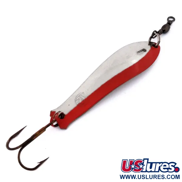 Ši 6 cm ilgio Italijoje pagaminta blizgė yra klasikinis Panther Martin Lampo Pesante da Lancio serijos pavyzdys. Nikeliuotas korpusas akcentuotas ryškia raudona juostele išilgai vieno krašto, kuri suteikia ryškų spalvų kontrastą poliruotam metalui. 11 g svorio masalo storis skirtas tolimiems metimams ir gilesniems vandens sluoksniams pasiekti, kur lengvesnės blizgės per daug kiltų į viršų. Ant paviršiaus matomas nedidelis gamintojo antspaudas, patvirtinantis kilmę ir prekės ženklo paveldą. Konstrukcijoje yra viršuje sumontuotas suktukas, apsaugantis nuo valo sukimosi, ir tvirtas trišakis kablys, pritvirtintas žiedeliu galinėje dalyje. Šis egzempliorius yra puikios 5/5 būklės, o atspindintis nikelio paviršius ir dažyti akcentai puikiai atrodo kartu su originaliu bronzos apdailos kabliu.