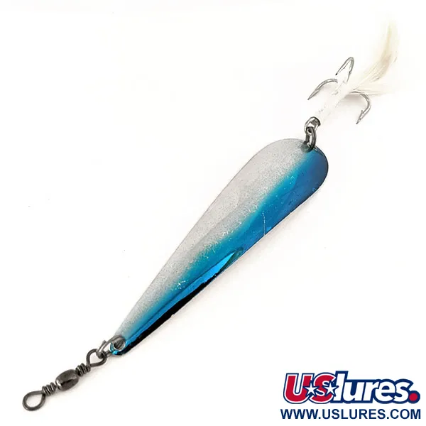 Panther Martin Sarda „Como“ con Penna pasižymi pailgu 11 cm profiliu – tai Italijoje kruopščiai pagaminta blizgė. Šio 18 g masalo apdaila padalinta į ryškiai mėlyną dalį ir tekstūruotą nikelio šoną, kuris sukuria ryškų vizualinį kontrastą lygiai, poliruotai nikelio nugarėlei. Prie trišakio kabliuko pritvirtintos baltos plunksnos suteikia metaliniam korpusui minkštos tekstūros elementą. Šis egzempliorius, identifikuojamas pagal prekės kodą 12559, yra nenaudotas ir išlaikęs originalią gamyklinę būklę, jo paviršiai ir furnitūra yra švarūs. Blizgė komplektuojama su juodu statinės formos suktuku, pritvirtintu prie priekinio žiedo – tai standartinė šio modelio savybė, palengvinanti montavimą spiningaujant ar velkiaujant. Meistrystė atspindi klasikinę itališką gamybą, būdingą Sarda serijai.
