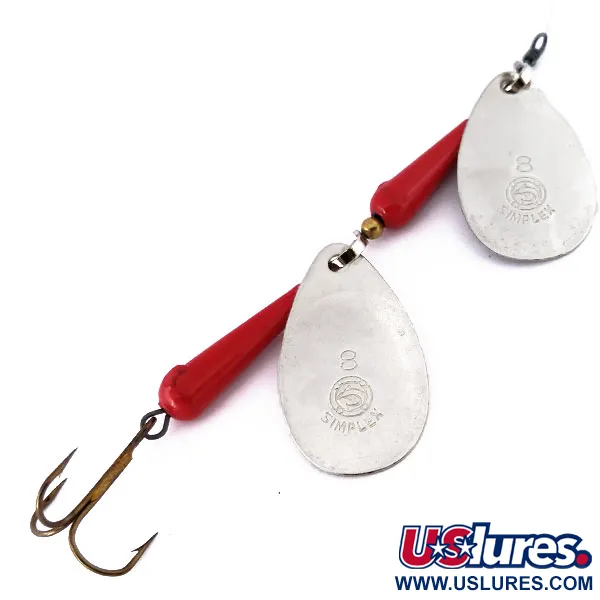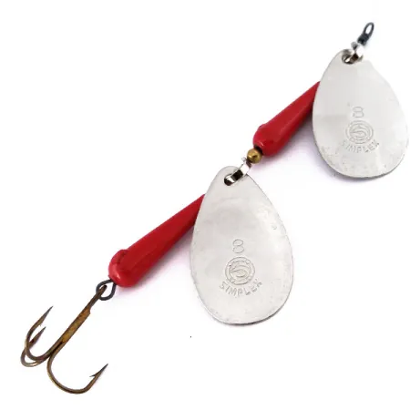 Ant nikeliuotų lapelių įspaustas klasikinis „SIMPLEX“ logotipas ir skaičius „8“ žymi šią Italijoje pagamintą Panther Martin Simplex Tandem sukriukę (prekės kodas 10546) kaip vertingą vintažinį modelį. 14 g (1/2 oz) svorio ir 10 cm (4") ilgio tandeminės sukriukės konstrukcija pasižymi dviem atskirais lapeliais, sumontuotais ant vienos vielinės ašies. Tarp šių lapelių ir gale esančio trišakio kabliuko sumontuoti kūginiai, ryškiai raudoni korpusai, atskirti mažais žalvariniais karoliukais. Skirtingai nuo standartinės vieno lapelio sistemos, ši konfigūracija padvigubina nikelio dangos matomumą ir atspindžius vandenyje. Šis konkretus egzempliorius yra nenaudotas, išlaikęs nepriekaištingą gamyklinę būklę nuo ašies iki pat kabliuko. Metalinės dalys išliko blizgios, pabrėždamos meistriškumą, būdingą šiems vidurio amžiaus Italijos eksporto gaminiams. Kiekvienas lapelis sukasi tiesiai aplink ašį – tai firminė dizaino savybė, leidžianti išvengti atskiro lankelio naudojimo. Aštrus trišakis kabliukas saugiai pritvirtintas gale, puikiai tinka žvejybai stiprioje srovėje ar giliose duobėse.