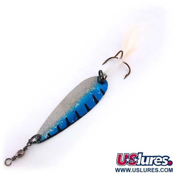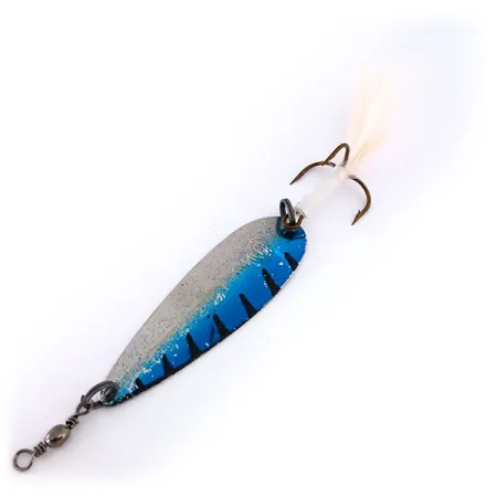 Sverianti tiksliai 3/16oz (6g), ši itališko meistriškumo Panther Martin Svizzero Siluro pasižymi aptakiu, lašo formos profiliu. 2 1/4" (6cm) korpusas išsiskiria ryškia Nikelio / Mėlyna apdaila: viršutinė dalis padalinta į blizgantį sidabrinį pagrindą ir sodriai mėlyną akcentą su tamsiomis vertikaliomis žymėmis. Apatinė masalo pusė yra poliruoto nikelio, skirta maksimaliam šviesos atspindžiui. Italijoje gamintos Panther Martin sukrės yra klasika senovinėse žūklės dėžutėse, o šis konkretus egzempliorius (produkto kodas 10259) yra 5/5 būklės. Furnitūra puikiai išsilaikiusi: žiedelis sujungtas su trišakiu kabliuku, papuoštu plunksnomis. Baltos plunksnos sukuria ryškų vizualinį profilį vandenyje, o galvutėje integruotas statinės formos suktukas padeda išvengti valo susisukimo metimų metu.