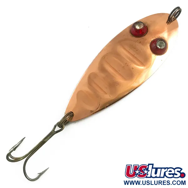 Varinė senovinių masalų apdaila visada nuostabiai atspindi šviesą, o šis sunkus 25 g (1 oz) modelis yra puikus vidurio amžiaus Amerikos meistriškumo pavyzdys. 8,5 cm (3 1/4") ilgio Paul Bunyan Ruby Spoon (produkto kodas 5883) išsiskiria firminėmis rubino raudonumo akimis, įstatytomis prie galvos. Korpusui būdingos trys ryškios briaunos arba „pakopos“, kurios suteikia metalui didelį konstrukcinį standumą. Kitoje pusėje rasite aiškų spaudą „PAUL BUNYAN RUBY SPOON“, nurodantį jo kilmę iš Paul Bunyan Bait Company JAV. Atsižvelgiant į 5/5 būklę, metaliniai paviršiai yra itin švarūs, išlaikę spindesį, kuris papildo gilią raudoną akių spalvą. Originali furnitūra, įskaitant didelį trišakį kabliuką ir viršutinę kilpą, išlieka tvirta. Nors kolekcininkai jų labai ieško, šios vartiklės vis dar yra legendinės tarp patyrusių žvejų dėl savo gebėjimo gaudyti žuvį praėjus dešimtmečiams po gamybos. Storas metalas leidžia masalui efektyviai nuskęsti ir pasiekti žuvis, tūnančias apatiniuose vandens sluoksniuose.