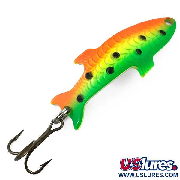 Ant nikelinės nugarėlės aiškiai išspaustas pavadinimas „PHOEBE“ – amerikiečių meistriškumo ženklas, identifikuojantis šią „Acme“ klasiką. 4 g (1/8 oz) svorio ir 4 cm (1 1/2") ilgio blisgė pasižymi ryškiu žuvies profiliu su išlietais peleko formos iškilimais palei išlenktą metalinį korpusą. Priekinėje dalyje matomas ryškus vaivorykštinio upėtakio raštas, kuriame naudojami fluorescenciniai ir UV spinduliams jautrūs dažai, reaguojantys specifinėmis apšvietimo sąlygomis. Šis masalas, žymimas prekės kodu 5083, turi aštrų bronzuotą trišakį kabliuką, pritvirtintą tvirtu žiedu gale. Hidrodinaminė konstrukcija leidžia jį efektyviai naudoti įvairiuose vandens sluoksniuose, tiek užmetant seklumose, tiek žvejojant didesniame gylyje. Išlaikęs originalią gamyklinę išvaizdą, masalas yra 5/5 būklės, o dažų sluoksnis ir metaliniai paviršiai neturi jokių nusidėvėjimo požymių.