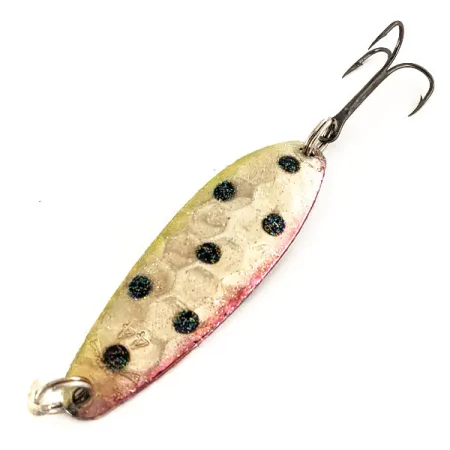 Kaltas korio raštas sukuria sudėtingą atspindį ant sidabruoto šios Pirate Lures blizgės paviršiaus – tai kokybiškas JAV pagamintas masalas. 6,5 cm (2 1/2") ilgio ir 12 g (2/5 oz) svorio Pirate Joe's Silver Plated modelis yra subalansuotas universaliam naudojimui. Viršutinė dalis pasižymi šviesiai žalsvai geltonu atspalviu, o pilvelis – rausvai raudonu tonu, kurį papildo septyni blizgantys juodi taškai, sukuriantys ryškius taikinius sidabriniame fone. Kitoje pusėje išryškėja blizgus sidabravimas ir įspausto žvynų rašto gylis. Su originaliais žiedeliais ir aštriu trišakiu kabliuku, šis 12483 kodu pažymėtas egzempliorius yra 5/5 būklės. Sidabrinė apdaila išlieka spindinti, demonstruojanti meistriškumą, būdingą vintažiniams Pirate Lures modeliams, skirtiems spiningavimui ir velkiavimui.