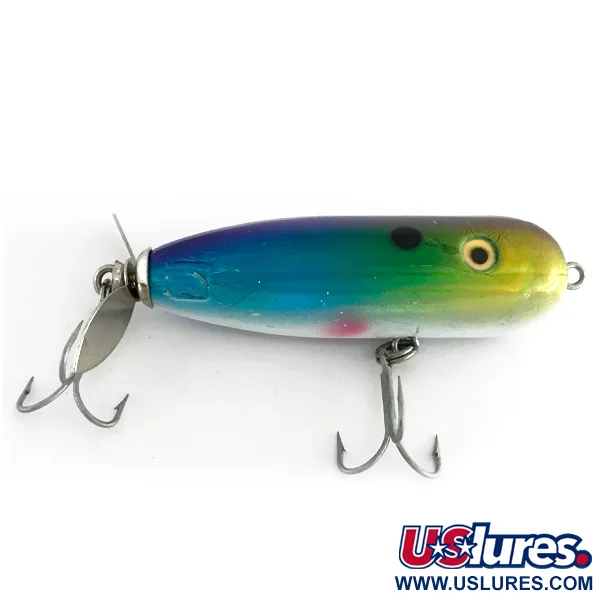 Ryškūs vaivorykštės atspalviai apibūdina šio 6,5 cm (2 1/2") paviršinio masalo apdailą: auksinė geltona spalva ties nosimi pereina į sodrią žalią, mėlyną ir gilią violetinę viršuje. Šis „Producers“ prekės ženklo modelis (kodas 8297) yra klasikinis amerikietiškas paviršinis įrankis, sukurtas kelti sumaištį vandens paviršiuje. Gale sumontuotas nerūdijančio plieno propeleris skirtas vandeniui kulti, o vidinė triukšmo kamera traukiant masalą skleidžia ritmingą garsą. Korpusas yra lygaus, pailgo profilio, su dviem aštriais trišakiais kabliukais, pritvirtintais sraigtinėmis kilpomis. Už galvos yra ryškus juodas taškas, o ant balto pilvo matomas mažas rožinis smūgio taškas. Dažytos geltonos akys su tamsiais vyzdžiais suteikia tradicinę išvaizdą smailėjančiai nosiai. Įvertintas 5/5 būkle, šis egzempliorius yra nepaprastai švarus, pasižymi ryškiais dažais ir blizgančiomis metalinėmis detalėmis. Sverdama 9,5 g (1/3 oz), ji turi pakankamai svorio tiksliems metimams gaudant pakrantės plėšrūnus.