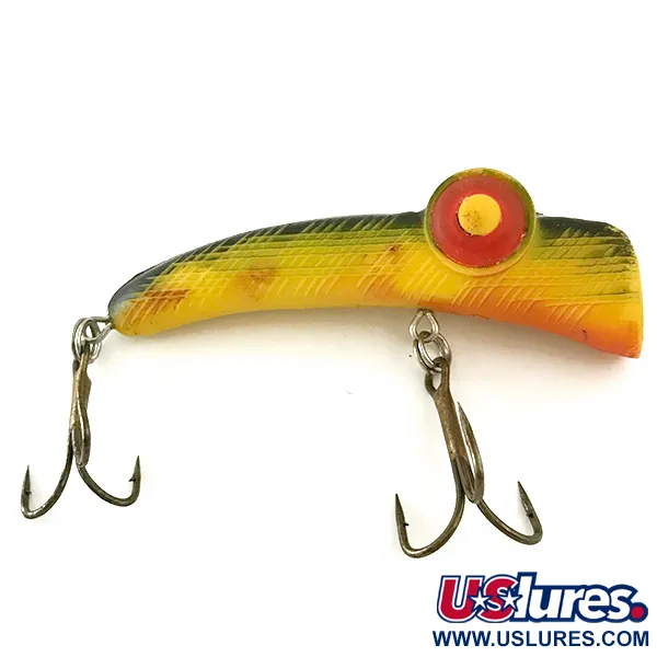 Visiškai JAV pagamintas „Rabble Rouser“ modelis išsiskiria savo firminiu geltonos, žalios ir raudonos spalvų deriniu. 6,5 cm (2 1/2") ilgio ir 6 g (3/16 oz) svorio masalas yra puikus drąsių estetinų sprendimų, būdingų vidurio amžiaus Amerikos žūklės įrankiams, pavyzdys. Korpusas pereina iš ryškiai geltono pilvo į tekstūruotą žalią nugarą, kurią puošia didelės, koncentrinės raudonos ir geltonos akys – šio prekės ženklo vizitinė kortelė. Produkto kodas 6657, masalas turi du trišakius kabliukus ir yra skirtas žvejybai paviršiuje arba seklumose, pasiekiantis iki 0,5 m (1,6 pėdos) gylį. Amerikietiško meistriškumo kolekcionieriams šio egzemplioriaus būklė yra išskirtinė, įvertinta 5/5 dėl puikiai išlaikyto dažų sluoksnio ir furnitūros. Nesvarbu, ar naudojamas spiningavimui, ar velčiavimui gaudant lydekas ir ešerius, konstrukcija atspindi patvarumą, kuriuo „Rabble Rouser Fishing Lures“ garsėjo savo gamybos laikotarpiu. Smulki tekstūra palei šonus imituoja subtilų žvynų raštą, gražiai atspindintį šviesą trijų spalvų gradiente.