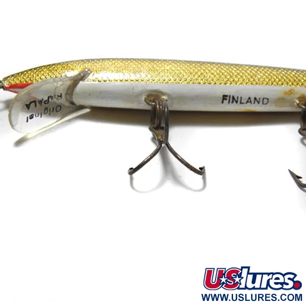 Šis 3/16 oz (5 g) sveriantis vintažinis balzos medžio vobleris ant balto pilvelio išdidžiai demonstruoja „Finland“ spaudą, liudijantį jo kilmę. 10 cm (4 colių) kūnelis yra „Golden / Natural“ spalvinimo, su blizgančia auksine žvynelių folija šonuose, pereinančia į vientisą juodą nugarėlę. Šis konkretus pavyzdys, pažymėtas prekės kodu 0221, yra 4/5 būklės, o furnitūra ir apdaila atrodo puikiai. Trys trišakiai kabliukai išdėstyti išilgai apatinės dalies, atspindint klasikinę tokio ilgio konfigūraciją. Skaidrus plastikinis liežuvėlis skirtas panardinti masalą į 0,9–1,5 m (3–5 pėdų) gylį tolygiai traukiant. Raudonas akcentas prie gerklės sukuria subtilų provokacijos tašką tiesiai už kilpelės, kuri yra Rapala ilgaamžiškumą garantuojančios vientisos vielos konstrukcijos dalis.