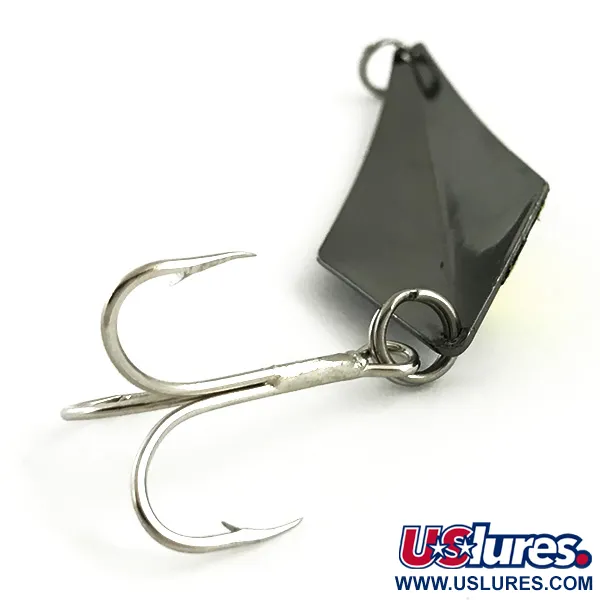 Banguota geltona juosta ryškiai išsiskiria tamsiame metaliniame 9 cm (3 1/2") masalo paviršiuje. Šis masalas, žinomas kaip Rebel Arrowhead UV (produkto kodas 5709), turi fluorescencinę dangą, kuri šviečia veikiama UV spindulių, todėl yra puikiai matoma giliame ar drumstame vandenyje. 17 g (3/5 oz) svorio kietas metalinis korpusas yra specialiai sukurtas spiningavimo ir džigavimo technikoms. Priekinėje dalyje tiesiai į metalą įspaustas pavadinimas „REBEL“, pabrėžiantis JAV gamybos kilmę. Galinė pusė yra vientiso tamsaus profilio, kuris sukuria ryškų vizualinį kontrastą su ryškiai geltonais akcentais priekyje. Būklė vertinama 5/5, paviršius išlaikęs švarų, blizgų blizgesį ir originalią furnitūrą. Vienas sustiprintas trišakis kablys gale pritvirtintas per žiedelį, o antrasis žiedelis priekyje užtikrina saugų valo tvirtinimą.