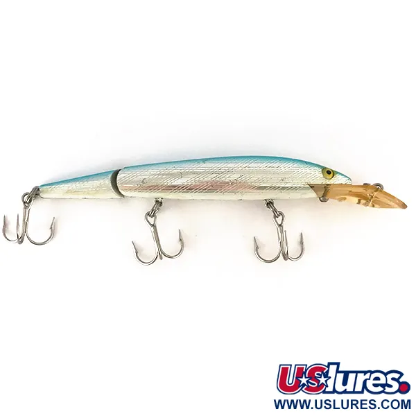 Sidabrinės-mėlynos spalvos žvynų raštai dengia šio masalo šonus, atspindėdami šviesą klasikiniu metaliniu blizgesiu, būdingu vintažinei JAV žvejybos įrangai. Atpažįstamas pagal produkto kodą 7843, šis Rebel Fastrac pasižymi nariuotina korpuso konstrukcija, kuri suteikia išskirtinį judėjimą tiek spiningaujant, tiek velkiaujant. Jis sveria 12,5 g (2/5 oz) ir yra 12 cm (4 3/4") ilgio, todėl yra puikiai pastebimas vandenyje. Padidintas, permatomas liežuvėlis yra specialiai sukurtas pasiekti 1,5–4 m (5–13 pėdų) gylį. Šis masalas yra 5/5 būklės, puikiai atrodo su originalia furnitūra ir aštriais trišakiais kabliukais. Pagamintas JAV, jis išlaiko klasikines geltonas akis ir švarų perėjimą nuo ryškiai mėlynos nugaros iki sidabrinių žvynuotų šonų – tai spalvų derinys, dažnai pasirenkamas dėl savo efektyvumo įvairiomis apšvietimo sąlygomis.