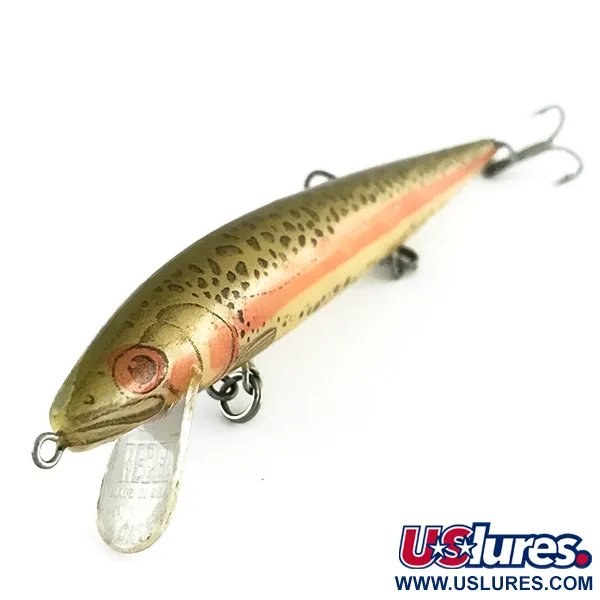 Papuoštas klasikiniu upėtakio raštu, šis 10 g plastikinis vobleris demonstruoja detalią apdailą, kuria išgarsėjo „Rebel“ prekės ženklas. 12 cm ilgio masalas turi auksinio atspalvio korpusą su ryškia rausva šonine linija ir tamsiomis dėmėmis, būdingomis vaivorykštiniam upėtakiui. Skaidrus liežuvėlis, pažymėtas „Rebel“ logotipu ir užrašu „MADE IN USA“, skirtas pasiekti 0,9–1,8 m gylį tiek spiningaujant, tiek velkiaujant. Trys trišakiai kabliukai tvirtais žiedeliais pritvirtinti prie pilvelio ir uodegos, sukuriant klasikinį šio plaukiančio masalo profilį. Šis konkretus pavyzdys (prekės kodas 8506) yra 5/5 būklės, išlaikęs originalų blizgesį ir skaidrias akių detales. Gamybos perėjimas prie plastiko leido sukurti šiuos sudėtingus žvynų raštus ir vidines kameras, kurios tapo firminiu šio prekės ženklo plaukiančių voblerių bruožu.