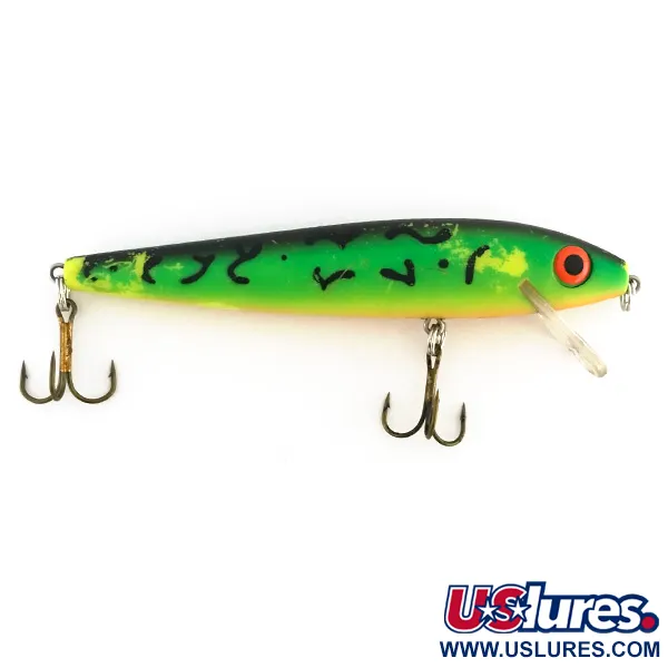 Šio 9 cm (3 1/2 colio) ilgio Rebel Floater plastikinis korpusas yra ryškios Green Tiger spalvos su tamsia nugara ir puikiai matomu geltonu pilveliu. Mažos juodos bangelės suteikia šonams būdingą tekstūrą, kurią papildo klasikinės raudonos akys, išsiskiriančios neoninės žalios spalvos galvos dalyje. Skaidrus liežuvėlis užtikrina 1,2–1,8 m (4–6 pėdų) nėrimo gylį, todėl tai patikimas pasirinkimas žvejybai spiningu sekliuose vandenyse arba lengvam velkiavimui. Šis 7 g (1/4 oz) masalas, kurio produkto kodas 8528, yra puikios būklės (įvertinimas 4/5), su originalia furnitūra ir gerai išlikusiais dažais. Tokie būdai kaip tolygus traukimas arba ritmingas „stop-and-go“ leidžia visapusiškai išnaudoti šio JAV pagaminto voblerio plūdrumą.