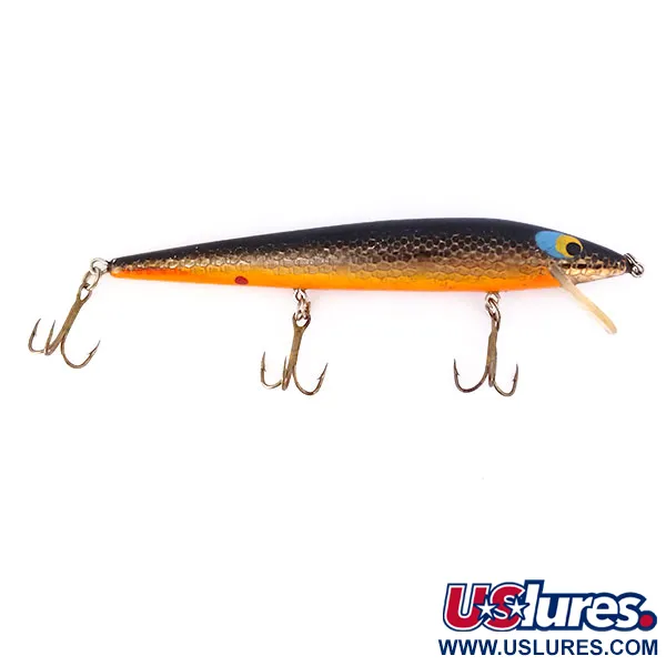 Vario ir aukso spalvos žvyneliai puošia šio 9 g (1/3 oz) plaukiančio minnow tipo voblerio šonus. Rebel Floater F12, kurio produkto kodas 10646, pasižymi kontrastinga juoda nugara ir ryškiai oranžiniu pilveliu, papildytu mažu raudonu tašku prie uodegos. Išskirtinis dizaino elementas – didelė, dažyta akis su mėlynu apvadu ir geltona rainele, atspindinti klasikinę JAV gamybos estetiką. 12 cm (4 3/4") ilgio masalas apginkluotas trimis bronzuotais trišakiais kabliukais ir skaidriu liežuvėliu, užtikrinančiu 1,5–2,1 m panirimo gylį. Būklė puiki (5/5), originalus padengimas ir furnitūra išlaikyta idealiai.