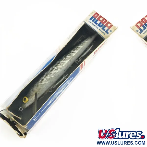 Sidabrinė žvynelių apdaila, kaip šiame „F12 Floater“ modelyje, puikiai atspindi praėjusio amžiaus vidurio Amerikos žūklės įrangos plastiko erą. Šis 9 g (1/3 uncijos) svorio ir 12 cm (4 3/4 colio) ilgio masalas yra nenaudotas ir puikiai išlaikytas originalioje pakuotėje su langeliu. JAV sukurti „Rebel“ masalai buvo vieni pirmųjų, pradėjusių naudoti aukštos kokybės plastiką, užtikrinantį stabilų plūdrumą ir ilgaamžiškumą. Šis konkretus modelis, kurio prekės kodas 23929, yra skirtas žvejybai 1,2–1,8 m (4–6 pėdų) gylyje tiek spiningaujant, tiek velkiaujant. Atspindintis šviesą sidabrinis korpusas turi tris tvirtus trišakius kabliukus, kurie pabrėžia „Rebel“ parinktą patikimą furnitūrą didesnio profilio „minnow“ tipo masalams. Ant pačios pakuotės matomas ankstyvasis prekės ženklo dizainas, primenantis istorinį bendrovės pakavimo stilių. Didelės akys geltonais apvadais tampa ryškiu akcentu tekstūruotų šonų fone. Skaidrus plastikinis liežuvėlis tvirtai integruotas į nosies dalį, užtikrinant, kad masalas išliktų numatytame 1,2–1,8 m gylyje tiek tolygiai traukiant, tiek žaidžiant su masalu „stop-and-go“ technika.