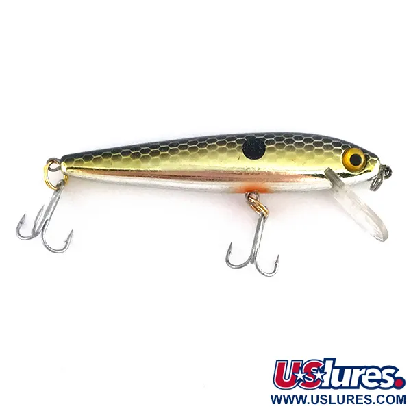 Šis JAV pagamintas plastikinis minnow vobleris pasižymi klasikiniu perėjimu iš auksinės į sidabrinę spalvą su išskirtiniu korių raštu ant nugaros, atspindinčiu patikimą dizainą, kuriuo garsėja Rebel. Sverdama 1/8 oz (4 g) ir būdama 2 3/4" (7 cm) ilgio, ši masalo versija turi produkto kodą 8013. Didelė juoda peties dėmė ir ryškios geltonos akys kontrastuoja su metaliniu kūnu – tai vizualinis bruožas, dažnai sutinkamas vintažiniuose modeliuose, imituojančiuose silkines žuvis. Kaip plaukiantis F7 modelis, jis sukurtas pasiekti 0,9–1,8 m (3-6 pėdų) gylį spiningaujant arba naudojant lengvą velkiavimą. Skaidrus, integruotas liežuvėlis ir originalūs sidabriniai trišakiai kabliukai yra puikios būklės, todėl šis masalas įvertintas 5/5 balais. Jo konstrukcija tvirta, skirta tolygiam traukimui arba techniškam „stop-and-go“ vedimui gėluose vandenyse.