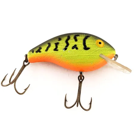 Fire Tiger raštas su kontrastingais neoninės geltonos ir oranžinės spalvos perėjimais paverčia šį 6,5 cm (2 1/2") voblerį puikiai matomu masalu. Rebel Mini R (produkto kodas 12868) pasižymi tekstūruotu korpuso paviršiumi, kuris gaudo šviesą po tamsiai alyvinės spalvos nugara ir ryškiomis juodomis vertikaliomis juostomis. Skaidrus, kvadrato formos liežuvėlis yra pažymėtas klasikiu Rebel logotipu ir sukurtas pasiekti nuo 0,4 m (1,3 ft) iki 1,2 m (3,9 ft) gylį. Šis 17 g (3/5 oz) svorio egzempliorius yra kolekcinis radinys (būklė 5/5), išlaikęs sodrią gamyklinę spalvą ir originalią furnitūrą. Nesvarbu, ar masalas naudojamas spiningavimui, ar velkiavimui, vandens sluoksnyje jis elgiasi kaip suspenderis (neutralaus plūdrumo). Pilvelis ties gerkle pereina į sodrią oranžinę spalvą, o geltonos akys su juodais vyzdžiais suteikia konkretų taikinio tašką. Abu trišakiai kabliukai yra puikios būklės, be jokių naudojimo ar nusidėvėjimo žymių ant gelių.