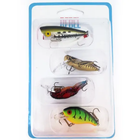 Šį „Rebel Ultralight Kit“ rinkinį (produkto kodas 10944) sudaro keturi skirtingi ultralight tipo masalai, esantys originalios, nenaudotos būklės. Kolekcija išlikusi originalioje pakuotėje, todėl masalai yra gamyklinės būklės. Rinkinyje yra kultinis 2 colių (5 cm) „Pop-R“, skirtas žūklei paviršiuje. „Crickhopper“ yra 1 1/2 colio (4 cm) ilgio ir dirba 0,5–0,9 m gylyje. Gilesniems sluoksniams skirtas „Teeny Wee-Crawfish“ — taip pat 1 1/2 colio (4 cm) — pasiekia 0,5–1,5 m gylį ir išsiskiria realistišku vėžio profiliu. Rinkinį užbaigia ryškaus „Fire Tiger“ spalvinimo „Teeny R“, 1 1/2 colio (4 cm) suspenderis, dirbantis 0,4–1,2 m diapazone. Kiekvienas modelis atspindi gamintojo patirtį kuriant masalus ešeriams, upėtakiams ir kitoms žuvims. Pakuotės nugarėlėje pabrėžiamas tinkamumas mažiems upeliams ir dideliems ežerams. Masalai apginkluoti mažais, aštriais trišakiais kabliukais, skirtais žūklei plonais valais.