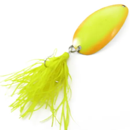Sidabrinis chromas šios 6 cm (2 1/4") blisgės nugarėlėje sukuria ryškų blyksnį, papildantį ryškiai geltoną ir oranžinį priekinį paviršių. Šis JAV pagamintas Red Eye Lures modelis (produkto kodas 3812) sveria 10,5 g (3/8 oz) ir yra skirtas velkiavimui tam tikrame gylyje. Prie galinio žiedelio pritvirtintas minkšto silikono sijonėlis (citrininės geltonos spalvos) maskuoja višakį kablys ir suteikia masalui papildomos tekstūros. Šis RED EYE modelis yra 4/5 būklės: dažai ant išgaubtos pusės puikiai išsilaikę, o įgaubtas vidus pasižymi švaria metaline apdaila. Tvirtinimo taškai yra tvirti, su viena kilpele galvutėje tiesioginiam valo rišimui arba suktukui su segtuku.