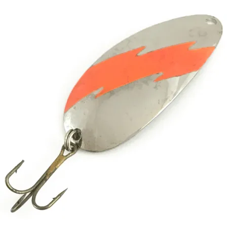 Nikelio danga suteikia klasikinį, ryškų blizgesį šiai 10,5 g (3/8 oz) blizgei, kurios išgaubtoje pusėje yra išskirtinis fluorescencinis oranžinis žaibo raštas. 6 cm (2 1/4") ilgio Red Eye blizgė (kodas 6626) pasižymi JAV gamybos tikslumu, o Red Eye Lures prekės pavadinimas aiškiai įspaustas įgaubtame viduje. Šis konkretus velkiavimui skirtas egzempliorius yra 5/5 būklės, išlaikęs ryškų, atspindintį paviršių ir sodrų pigmentą be žymių nusidėvėjimo požymių. Konstrukciją sudaro tvirtas trišakis kablys, pritvirtintas sustiprintu žiedeliu, skirtu atlaikyti apkrovas velkiaujant giliuose vandenyse. Tiksliai išgręžta tvirtinimo anga viršūnėlėje leidžia tiesiogiai rišti valą arba naudoti segtuką, išlaikant aptakų masalo profilį.
