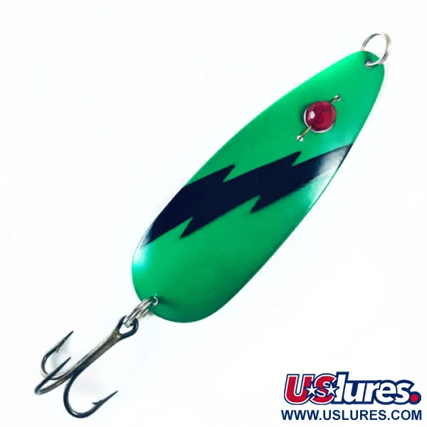 Ryškus juodas žaibo raštas kerta šios vintažinės vartiklės ryškiai žalią paviršių – tai išskirtinis „Eppinger Red Eye Evil Eye“ serijos bruožas. Ši 3 1/2 colio (9 cm) vartiklė turi ikonišką briaunuotą raudoną stiklo karoliuką, nuo kurio kilo „Red Eye“ pavadinimas, saugiai pritvirtintą prie galvutės kaip ryškų taikinį žuviai. 1/3 uncijos (9 g) svorio masalas skirtas universaliam spiningavimui ar velčiavimui, pagamintas laikantis aukštų JAV gamybos standartų. Galinė pusė yra baltos spalvos, sudaranti ryškų kontrastą su ryškiai žaliu viršumi. Visa furnitūra yra puikios būklės, įskaitant tvirtus žiedelius ir stiprų trišakį kabliuką. Identifikuotas produkto kodu 1735, šis konkretus Žalia / Balta variantas yra klasikinis vidutinio dydžio masalo pavyzdys. Įvertintas 5/5, masalas pasižymi aiškiomis dažymo linijomis, o stiklinė akis išlieka skaidri ir be įskilimų.