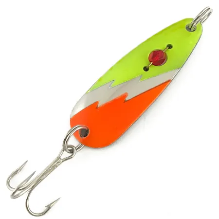 Geltoni ir oranžiniai dažai derinami su poliruoto nikelio apdaila šios 14 g (1/2 oz) blizgės paviršiuje. Kitoje pusėje aiškiai išspaustas Red Eye Lures prekės ženklas bei kilmės šalis USA – kokybės ženklas, kurio kolekcininkai ieško Red Eye Evil Eye modelyje. Šis konkretus egzempliorius, pažymėtas kodu 7319, yra 5,7 cm (2 1/4") ilgio ir turi firminę raudono karoliuko „akį“, suteikiančią masalui pavadinimą ir sukūriančią ryškų vizualinį kontrastą. Įrangą sudaro aštrus trišakis kablys ir dvigubi žiedeliai patikimam valo tvirtinimui. Išlaikyta 5/5 būklė, emalio spalvos yra ryškios, o metaliniai paviršiai pasižymi blizgesiu ir atspindinčiomis savybėmis.
