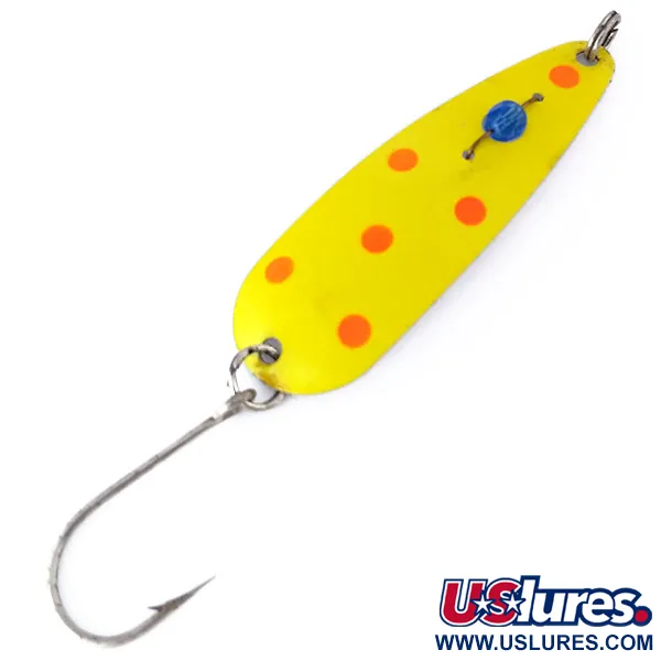 Geltoni dažai ir ryškiai raudoni taškai dengia šios 7,5 cm (3") ilgio Eppinger Red Eye Evil Eye UV vartiklės korpusą. Šis masalas, pažymėtas prekės kodu 10496, turi serijai būdingą mėlyną stiklo karoliuko „akį“, įtvirtintą centre. Nors dienos šviesoje jis atrodo ryškiai geltonas, jo danga sukurta taip, kad veikiamas UV spindulių švytėtų liuminescencine žalia spalva – tai techninė detalė, skirta padidinti matomumą gilesniuose vandens sluoksniuose. Masalas apginkluotas vienu didelės angos kabliu ir tvirtu žiedeliu, pritaikytu būtent velkiavimui. Šis egzempliorius yra 5/5 būklės, išlaikęs lygų paviršių ir skaidrų stiklo karoliuką. 6 g (3/16 oz) svoris suteikia tvirtumo pojūtį kompaktiškam masalo profiliui.