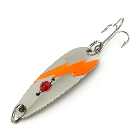 Nikeliuotas paviršius sukuria itin blizgų foną ryškiai oranžiniam žaibo lipdukui ant šios „Red Eye Lures Evil Eye UV“ blizgės. Ši blizgė, žymima prekės kodu 7556, sveria 1/2 oz (14 g) ir yra 2 1/4 colio (5,7 cm) ilgio. Išskirtinis šio JAV pagaminto modelio bruožas – briaunotas raudonas karoliukas, įmontuotas į blizgės korpusą prie viršutinio žiedelio, kuris šviesą atspindi kitaip nei poliruotas metalas. Veikiamas ultravioletinių spindulių, oranžinis fluorescencinis žaibas ryškiai švyti, taip padidindamas masalo matomumą gilesniuose ar tamsesniuose vandenyse. Masalas komplektuojamas su standartiniu trišakiu kabliu ir tvirtais žiedeliais. Šis konkretus gaminys yra nenaudotas, išlaikęs originalią gamyklinę apdailą be jokių nusidėvėjimo žymių.