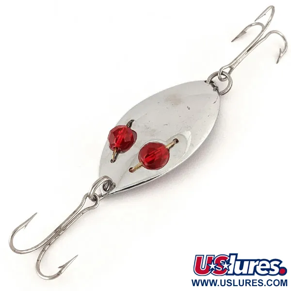 Didelės, šviesą atspindinčios raudonos akys apibūdina šios nikeliuotos blisgės, kurios produkto kodas yra 12440, vizualinį patrauklumą. 13 g (1/2 oz) svorio ir 5,5 cm (2 1/4") ilgio Hofschneider Corp. „Red Eye junior“ yra pagrindinis amerikietiškos vintažinės žūklės įrankis. JAV pagamintas korpusas sukonstruotas technikoms, kurioms tinka lėtas traukimas, leidžiantis lydekoms ir ešeriams vasaros karštyje susikoncentruoti į blizgančią furnitūrą. Du aštrūs trišakiai kabliukai sumontuoti abiejuose masalo galuose, suteikiant kelis kibimo taškus smalsiems plėšrūnams. Šio egzemplioriaus būklė vertinama 5/5, matomas gerai išlaikytas poliruotas paviršius ir saugiai pritvirtinti briaunoti raudoni karoliukai. Gamintojo spaudas įgaubtoje pusėje išlieka ryškus ir įskaitomas, patvirtinantis jo, kaip autentiškos vidurio amžiaus žūklės istorijos detalės, kilmę.