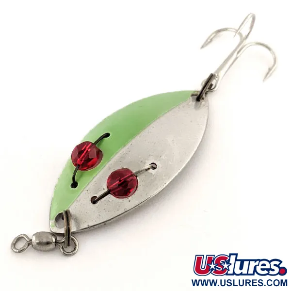 Ant štampuoto nikelio korpuso išsiskiria du briaunoti raudoni stiklo karoliukai, kurie yra šio Eppinger Red Eye junior modelio pavadinimo pagrindas. 5,5 cm (2 1/4") ilgio blizgė pasižymi dviejų tonų estetika: pusė poliruoto nikelio paviršiaus padengta vientisa žalia spalva. Šis konkretus modelis, prekės kodas 12801, skirtas lėtam traukimui, todėl ši blizgė yra istorinė klasika žvejojant vasarines lydekas ir ešerius. Apatinėje dalyje aiškiai įspaustas užrašas „RED EYE SPINNING LURE“, nurodantis jos vietą JAV gaminamų amerikietiškų žūklės įrankių linijoje. 11 g (2/5 oz) svorio masalas turi didelį trišakį kabliuką ir iš anksto sumontuotą statinės formos suktuką valui tvirtinti. 5/5 būklės apdaila yra puikiai išsilaikiusi, o spalvos ant metalinio paviršiaus išlieka ryškios.