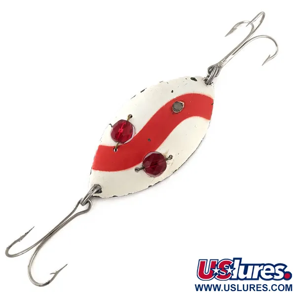 Įstrižos raudonos juostos baltame fone apibūdina šios JAV gamybos blizgės apdailą, užtikrinančią puikų matomumą įvairiomis vandens sąlygomis. Sverianti 25 g (1 oz) ir 7,5 cm (3") ilgio, ši Hofschneider Red Eye Wiggler (prekės kodas: 11541) pasižymi ikoniškais briaunotais raudonais stiklo karoliukais, įmontuotais į metalinį korpusą. Šios „akys“ skirtos sugauti ir atspindėti šviesą – tai pagrindinė savybė, dėl kurios šis modelis tapo nepakeičiamu gaudant lydekas ir ešerius nuo XX a. vidurio. Kita masalo pusė yra balta, ant jos aiškiai matomas įspaustas pavadinimas „RED EYE WIGGLER“ bei gamintojo ženklas. Su dviem trišakiais kabliukais, pritvirtintais tvirtais žiedeliais, konstrukcija yra tvirta mėtymui ar velkiavimui. Šis egzempliorius yra 4/5 būklės, matomas nedidelis dažų nusitrynimas kraštuose ir tam tikras furnitūros nusidėvėjimas, atspindintis jo, kaip funkcionalaus įrankio, skirto lėto traukimo technikoms, istoriją.