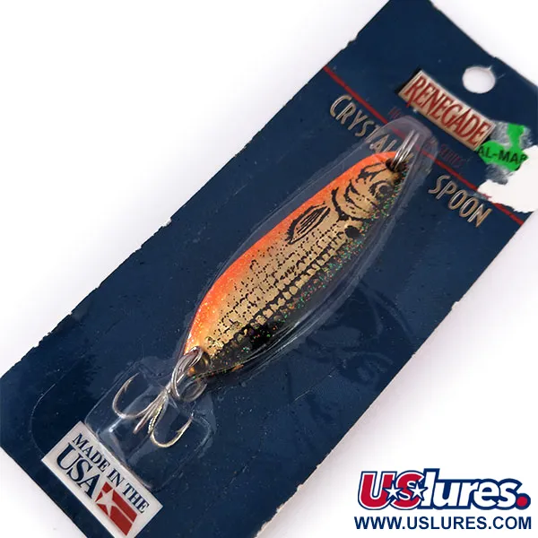 Sverianti 11 g, ši „Renegade Crystalina Spoon“ blizgė pasižymi briaunuotu „korėtu“ paviršiumi, sukurtu sukurti daugialypį atspindį. Šis nenaudotas egzempliorius, pažymėtas prekės kodu 12348, yra kalto aukso ir oranžinės spalvos apdailos su juodu žuvies raštu palei šoną. 5,5 cm ilgio masalas turi sidabruotą trišakį kabliuką ir tvirtą žiedelį. Pagaminta JAV, Indianoje (Pensilvanija), „Crystalina“ serija buvo pristatyta kaip specializuotas įrankis upėtakių ir kitų plėšrių žuvų žvejybai. Ryški oranžinė juosta palei nugarą pereina į šviesią kalto aukso tekstūrą, kuri skirta imituoti mažos žuvelės žvynus ir vizualų profilį.