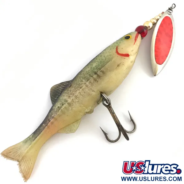 Žali ir raudoni tonai apibrėžia šio 40 g (1 1/3 oz) Renosky Lures asortimento modelio (produkto kodas 4520) išvaizdą. 17 cm (6 3/4") ilgio masalas pasižymi minkštu, tikrovišku kūnu, kuriame matomas natūralus perėjimas nuo alyvuogių žalumo nugaros iki blyškios, kreminės papilvės. Galvos dalyje sumontuotas karklo formos sukrės lapelis su ryškiu raudonu intarpu, šalia aukso spalvos karoliukų ir vieno raudono akcento karoliuko. Pilvo dalyje įmontuotas tvirtas, gerai išsilaikęs trišakis kabliukas, pritvirtintas prie vidinio vielos rėmo. Kolekcionieriai įvertins rankomis dažytas detales, įskaitant geltonai juodą akį ir ryškiai raudoną žiaunų liniją. Kūnas turi subtilius vertikalius raštus ir tekstūruotus pelekus, išlaikant labai aukštą kokybę, atitinkančią 5/5 būklės įvertinimą. Pagaminta JAV, šio Renosky modelio meistriškumas pabrėžia prekės ženklo gebėjimą sujungti blizgius metalinius elementus su tekstūruotu minkšto plastiko profiliu.