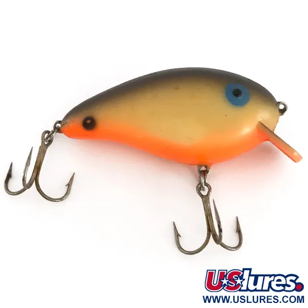 7 cm ilgio Rogers Big Jim pasižymi klasikiniu spalviniu profiliu: tamsiai dūminė ruda nugara pereina į kreminę rusvą vidurinę dalį ir ryškiai oranžinį pilvą. Šis konkretus modelis, pažymėtas produkto kodu 7769, sveria 14 g (1/2 oz), todėl turi pakankamai masės tiksliems metimams prie povandeninių kliūčių. Konstrukcijoje yra skaidrus integruotas liežuvėlis ir pora aštrių trišakių kabliukų, o priekinė kilpelė įtaisyta aukštai ant nosies. Išskirtinis bruožas – padidinta, mėlynai nudažyta akis su juodu vyzdžiu, kuri yra Rogers masalų vizitinė kortelė nuo pat įmonės įkūrimo 1959 metais. Pagamintas JAV, paviršius išliko stebėtinai švarus, todėl būklė vertinama 5/5. Oranžinis atspalvis tęsiasi nuo pasmakrės per visą pilvą, ryškiai kontrastuodamas su blankesniais viršutinės kūno dalies tonais ir sidabrinėmis detalėmis.