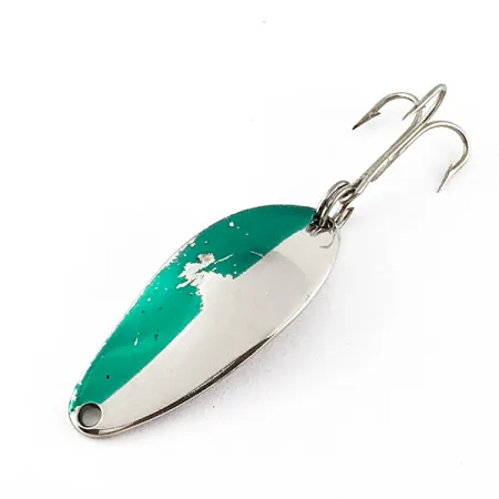 Nikelio ir žalios spalvos apdaila dominuoja šios 4 cm (1 1/2") blizgės išvaizdoje – tai klasikinio amerikietiško „Seneca“ žūklės įrangos dizaino pavyzdys. Sverdama 7 g (1/4 oz), ji pasižymi universaliomis užmetimo savybėmis, o svorio paskirstymas yra pritaikytas tolimiems metimams. Apvertus metalinį korpusą, matomas kultinis įspaudas „LITTLE CLEO WIGL-LURE A SENECA LURE“, patvirtinantis jos kilmę iš JAV. Dažytoji pusė yra ryškiai žalios spalvos, dengiančios pusę paviršiaus, ir turi nedidelių naudojimo žymių, atitinkančių 4/5 būklės įvertinimą. Jos konstrukcijoje naudojamas tvirtas žiedelis ir standartinis trišakis kablys. Kolekcionuojantiems konkrečius variantus, šis egzempliorius atpažįstamas pagal prekės kodą 21959. Poliruoto nikelio pusė išlaiko ryškų blizgesį, kuris stipriai kontrastuoja su žalia apdaila.
