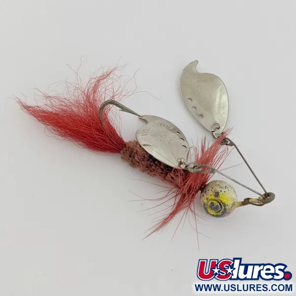 Tiesiogiai nikelio lapeliuose įspausti ženklai „SHANNON“ ir „PAT PEND USA“ – tai Jamison dizaino parašas, gamintas nuo XX a. 3-iojo iki 5-ojo dešimtmečio. Šis 5 cm Shannon Twin Spinner sujungia dvigubus lapelius su ryškiai raudona plunksnų uodega ir tekstūruotu rudu šenilo kūnu. 10 g sveriantis švininis galvutės svoris pasižymi autentišku charakteriu su pasenusiais geltonais ir juodais dažais (būklė 4/5). Vielinis rėmas laiko sukures virš kūno – tai sprendimas, skirtas žvejybai tankioje augmenijoje ar žolynuose. Raudonos plunksnos išlieka stebėtinai tankios ir ryškios, sudarydamos ryškų kontrastą nikeliuotiems lapeliams. Kodas #24491 žymi Shannon kaip ankstyvąją inovaciją tarpžolių masalų dizaine.