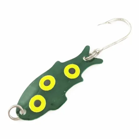 Varlės raštai jau seniai yra neatsiejama lengvosios žūklės dėžučių dalis, o ši sodri žalia Shoff's Big Triple Teazer spalva pabrėžia klasikinį amerikietišką masalų dizainą. 3,5 cm ilgio ir 2 g svorio maža vartiklė turi tris ryškias geltonas dėmes su juodais viduriais, išdėstytas išilgai šono. Žuvies formos siluetas pasižymi būdinga išpjova uodegos dalyje bei kokybišku vienšakiu kabliuku, pritvirtintu tvirtu žiedeliu. Šis JAV pagamintas Shoff's egzempliorius (produkto kodas 24022) yra 5/5 būklės – dažų sluoksnis ryškus, o furnitūra išlikusi puikiai. Metant šį lengvą masalą lengvos (light) arba itin lengvos (ultralight) klasės įrankiais, galima tiksliai pataikyti prie kliuvinių ar augmenijos.