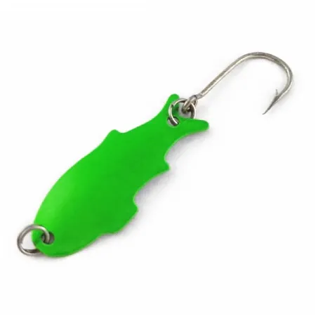 Padengta ryškia neonine žalia spalva, ši metalinė vartiklė pasižymi išskirtiniu žuvies formos profiliu, būdingu Shoff's Big Triple Teazer modeliui. Šis JAV pagamintas egzempliorius turi produkto kodą 24024 ir atspindi paprastą funkcionalumą, būdingą senajai amerikietiškai lengvosios žūklės (finesse) įrangai. Sverdama vos 2 g (1/16 oz), ši vartiklė puikiai tinka žvejybai su plonais valais, kai kibimui išprovokuoti reikalingas nedidelis masalo siluetas. Masalo korpusas yra 3,5 cm (1 1/2") ilgio, o palei apatinį kraštą esančios įrantos padeda sukurti žuvelę primenantį siluetą. Šio konkretaus pavyzdžio būklė vertinama 5/5 – išlaikyta lygi, vientisa danga bei švarūs metaliniai komponentai. Masalas komplektuojamas su vienu plačiu kabliuku, pritvirtintu tvirtu žiedeliu, o viršutinėje dalyje esantis toks pat žiedelis užtikrina patikimą valo tvirtinimą.