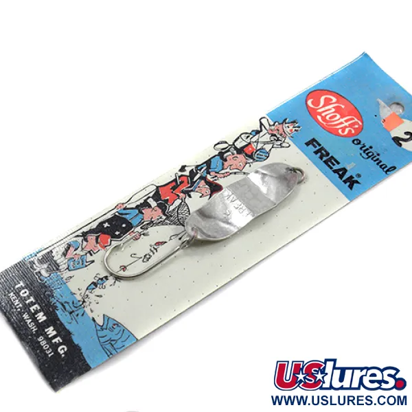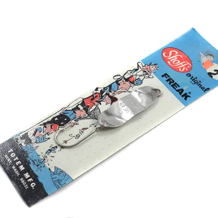 Ant atspindinčio sidabrinio lapelio aiškiai iškaltas skaičius „2“ ir modelio pavadinimas „FREAK“, identifikuojantis šią klasikinę Šiaurės vakarų regiono blizgę. Pagamintas su „Shoff's“ prekės ženklu ir platinamas „Totem Mfg.“ (Kent, Vašingtonas), šis 5,5 cm (2 1/4") masalas demonstruoja kokybišką vintažinės amerikietiškos žūklės įrangos meistriškumą. Sidabro danga yra išskirtinai švari, nes gaminys nenaudotas, išlaikęs originalų blizgesį be jokių senėjimo ar sandėliavimo požymių. 12 g (2/5 oz) svorio lapelis sukomplektuotas su tvirtu vienšakiu kabliuku, skirtu užtikrintam pakirtimui. Originali pakuotės kortelė papuošta žavingomis vidurio amžiaus žvejų iliustracijomis, suteikiančiomis istorinio charakterio produkto kodui 1885. Išskirtinė forma ir rumbuotas paviršius yra dizaino, skirto spiningavimui ar velčiavimui įvairiomis vandens sąlygomis, bruožai.