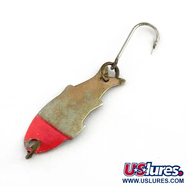 Ryškus raudonų dažų akcentas ant šios varinės vartiklės priekinės dalies sukuria išskirtinį dviejų spalvų derinį. Ši Shoff's Triple Teazer (prekės kodas 23602) yra 3 cm ilgio ir sveria vos 1,1 g. JAV pagamintas masalas pasižymi štampuotu žuvies formos profiliu su praplatėjusia uodegos dalimi, prie kurios pritvirtintas vienšakis kablys. Furnitūra išlieka funkcionali: žalvario spalvos žiedelis patikimai jungia kabliuką su korpusu. Vertinant 4/5 būklę, metalinis paviršius turi šiek tiek nusidėvėjimo žymių, originali danga vietomis pablukusi, tačiau raudoni akcentai išlieka ryškūs ir aiškūs. Žvejai tokias itin lengvas vartikles paprastai naudoja „ultralight“ spiningavimui arba kaip papildomą vilioklį. Valo tvirtinimo kilpelė eina tiesiai per dažytą priekinę dalį, pabrėžiant liekną masalo profilį.