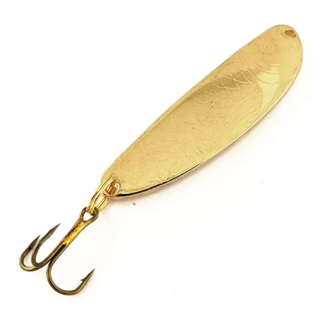 Aukso danga suteikia veidrodinį blizgesį šio klasikinio vartiklės tipo masalo 5,8 cm (2 1/4") korpusui. 9 g (1/3 oz) sveriantis Acme Side-winder S-100 (kodas 12278) pasižymi detaliu žuvų žvynų graviravimu ir štampuotu žiaunų raštu ant išgaubtos pusės. Šis egzempliorius yra 5/5 būklės, išlaikantis vientisą atspindintį paviršių tiek ant tekstūruoto priekio, tiek ant lygaus, poliruoto galo. Pagaminta JAV, vientiso metalo konstrukciją papildo aukso spalvos žiedelis ir aštrus trišakis kablys gale. Tiksliai išgręžta anga siaurame gale tarnauja kaip valo tvirtinimo vieta, išlaikant aptakų profilį, skirtą spiningavimui ir velkiavimui.