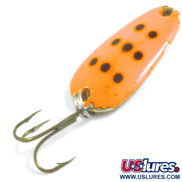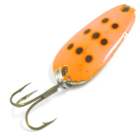 Ant auksinio atspalvio nugarėlės aiškiai išspaustas „SØLV-KROKEN NORWAY“ ženklas identifikuoja šią 3 cm vartiklę kaip klasikinį skandinaviško meistriškumo pavyzdį. 7 g sverianti masalas pasižymi ryškiu Raudona / Auksinė raštu: priekinė dalis yra ryškiai oranžinės spalvos su septyniais tamsiais taškais. Įrangą sudaro vienas trišakis kabliukas, pritvirtintas žiedeliu apačioje, tinkantis įvairiems metimo ir velkiavimo būdams. Šis konkretus egzempliorius, pažymėtas prekės kodu 4437, yra įvertintas 4/5 būkle – matomas tik nedidelis paviršiaus nusidėvėjimas, atitinkantis amžių, o konstrukcija išlieka tvirta. Norvegiška „Sølvkroken“ prekės ženklo kilmė akivaizdi iš tvirto metalinio korpuso ir tikslaus įspaudo ant poliruotos nugarėlės.