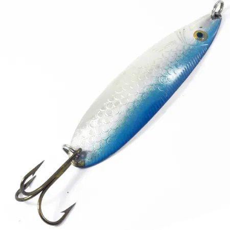 Sidabrinis žvynų raštas su ryškiu mėlynu blyksniu palei briauną apibūdina šios klasikinės norvegiškos vartiklės apdailą. 1/2 oz (15 g) sverianti Storlaksen yra pagrindinis įrankis žvejams, gaudantiems lašišas ir didelius upėtakius, dažniausiai naudojamas spiningavimui arba velčiavimui tekančiame vandenyje. 3 1/2" (9 cm) ilgio masalas turi autentišką „Sølvkroken Storlaksen“ įspaudą, giliai iškaltą ant poliruotos sidabrinės nugarėlės. Šis konkretus egzempliorius pažymėtas produkto kodu 3354 ir atspindi aukštos kokybės metalo apdirbimą, būdingą pagrindiniam Norvegijos žūklės reikmenų gamintojui. Masalas turi tvirtą, bronzuotą trišakį kabliuką, pritvirtintą stipriu žiedeliu, todėl yra paruoštas didelėms apkrovoms. Jo būklė yra puiki (5/5), paviršiai itin švarūs, o tekstūruotos priekinės dalies detalės ryškios. Papildomas žiedelis priekyje užtikrina saugų tašką tiesioginiam valo rišimui arba suktukui.