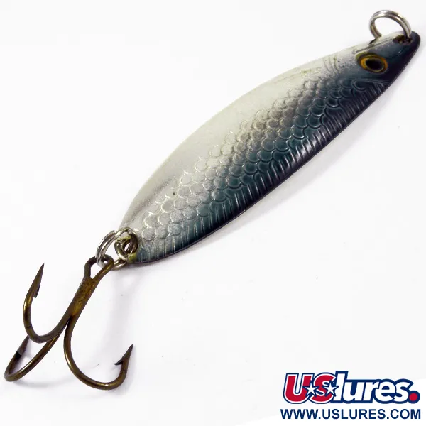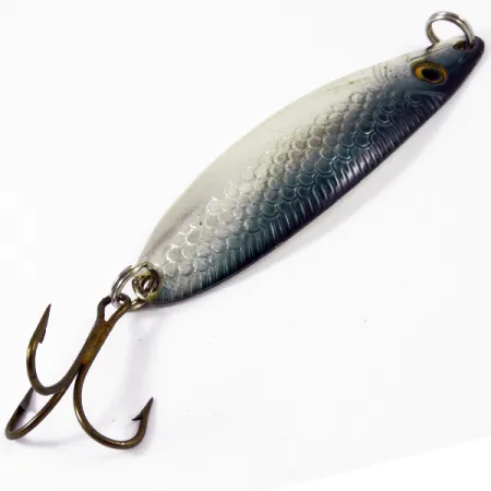 Klasikinis silkės žvynų raštas puošia šios 7,5 cm (3 colių) vartiklės viršų, pereinantį iš giliai melsvai pilkos nugaros į spindintį sidabriškai baltą pilvą. Iš Norvegijos kilusi Sølvkroken Storlaksen vartiklė (produkto kodas 3356) yra skandinaviškos lašišų ir šlakių žūklės įrankių klasika. 10 g (1/3 uncijos) svorio pailgas, šiek tiek išlenktas korpusas kitoje pusėje aiškiai pažymėtas prekės ženklu ir užrašu „Norway“. Furnitūra yra puikios būklės: du tvirti žiedeliai ir bronzuotas trišakis kabliukas, tinkamas tiek spiningavimui, tiek lengvam velkiavimui. Galvoje nupiešta geltona akis su juodu vyzdžiu suteikia plėšriosioms žuvims tikrovišką taikinį. Šis egzempliorius yra 5/5 būklės, išlaikęs poliruotą metalo blizgesį. Vidinėje sidabrinėje pusėje išlikęs nedidelis žalias taškas iš ankstesnio savininko kolekcijos laikų.