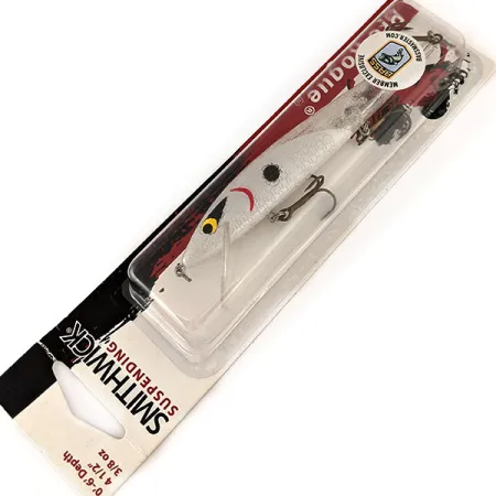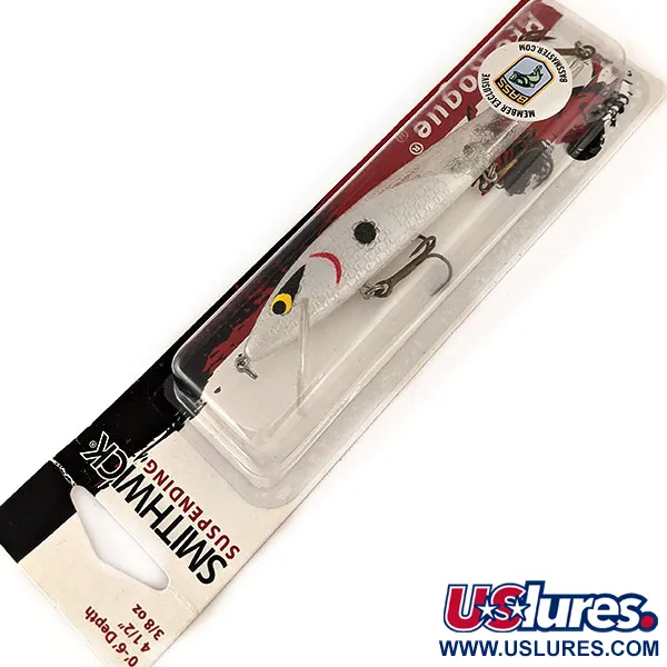 Švari White spalva puošia šio 11 cm (4 1/4") jerkbait tipo voblerio korpusą – tai klasikinė forma viliojant neutraliame gylije kabančias žuvis. 11 g (2/5 oz) svorio masalas sukonstruotas taip, kad vandenyje išliktų neutralaus plūdrumo; ši technika itin veiksminga, kai norint išprovokuoti puolimą reikia pauzės. Šis Smithwick Suspending Rattlin’ Rogue (prekės kodas 11154) yra nenaudotas, originalioje JAV gamybos pakuotėje. Masalas apginkluotas trimis aštriais trišakiais kabliukais ir turi skaidrų liežuvėlį, pritaikytą 0–1,8 m (0–6') gyliui spiningaujant arba iki 3,1–4,2 m (10–14') velkiaujant. „Bassmaster Member Exclusive“ lipdukas ant pakuotės išskiria šį egzempliorių kaip kolekcinį. Voblerio viduje esantys barškučiai suteikia papildomą akustinį efektą.