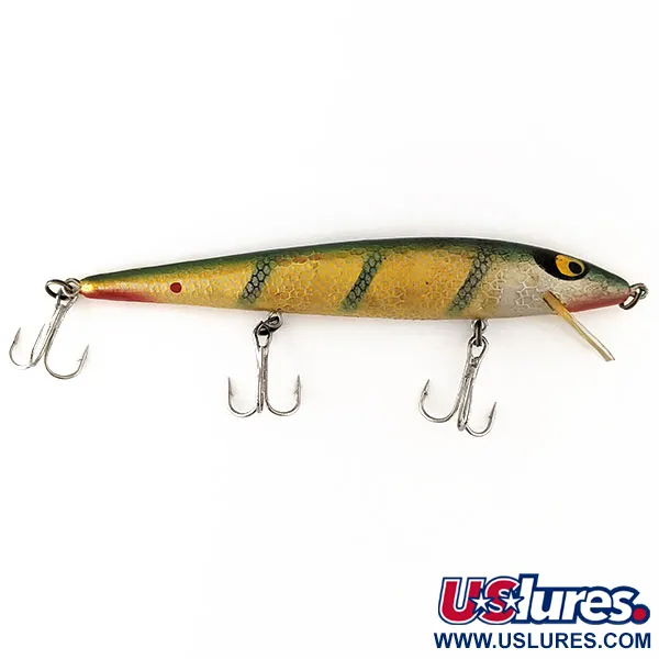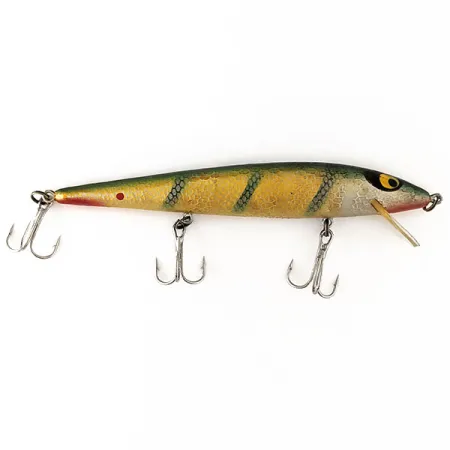 Ešerio rašto vertikalūs dryžiai ant šilto auksinio korpuso apibūdina šį Smithwick Suspending Rattlin’ Rogue. Šis 12,07 cm ilgio masalas, kurio produkto kodas 11173, sveria 11,34 g ir yra JAV žūklės istorijos klasika. Apdaila yra puikios būklės (įvertinimas 5/5), išryškinanti raudonai dažytą gerklę ir ikonines dideles geltonas akis su juodais vyzdžiais. Sukurtas kaip „suspending“ modelis su vidiniais barškučiais, jis išlaiko neutralų plūdrumą vandenyje. Metant paneria nuo 0,3 m iki 2 m, o velkiaujant – nuo 3 m iki 4 m. Turi tris trišakius kabliukus ir skaidrų, apvalų liežuvėlį.