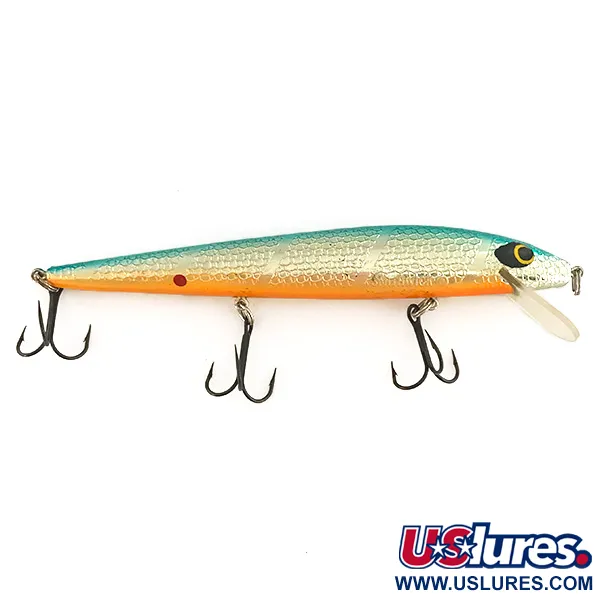 Ryškiai oranžinis pilvelis sukuria ryškų kontrastą su sidabriniais šio Smithwick Suspending Rattlin’ Rogue voblerio šonais, gaminio kodas 7496. 11,5 cm (4 1/2") ilgio ir 10 g (1/3 oz) svorio korpusas turi melsvai žalsvą nugarėlę ir klasikinę raudoną žiaunų dėmę. Šis modelis yra puikios 5/5 būklės, žvynelių raštas ir danga be jokių naudojimo žymių. Su skaidriu liežuvėliu vobleris pasiekia 0,3–2 m gylį spininguojant arba 3–4 m velkiaujant. Apačioje tvirtai sumontuoti trys tamsūs trišakiai kabliukai. Vidinė barškėjimo sistema ir neutralus plūdrumas yra pagrindinės šio JAV pagaminto masalo savybės. Geltonai apvadinės juodos akys prie nosies užbaigia masalo profilį.