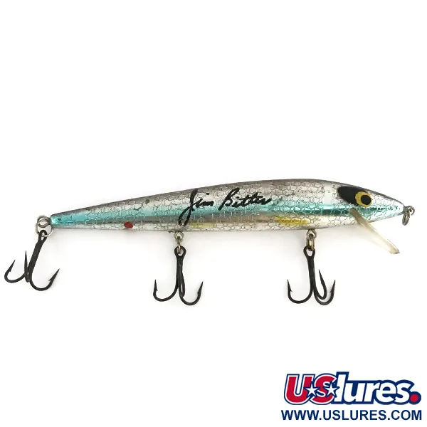 Ryškus „Jim Bitter“ parašas puošia šio sidabriniais žvynais marginto modelio šoną, nurodydamas, kad tai profesionalus įrankis iš „Smithwick“ asortimento. 10 g (1/3 oz) svorio ir 11,5 cm (4 1/2") ilgio „Suspending Rattlin’ Rogue“ pasižymi tekstūruota sidabro folijos apdaila, kuri nugaroje pereina į ryškiai mėlyną spalvą. Šis modelis, pažymėtas produkto kodu 8101, yra klasikinė barškanti „minnow“ tipo imitacija, sukurta universalumui: mėtant pasiekia 0,3–2 m gylį, o trolinguojant – iki 3–4 m. Masalo viršuje juodomis raidėmis aiškiai įspausta „RATTLIN' ROGUE“, komplektacijoje yra trys tamsūs trišakiai kabliukai ir skaidrus liežuvėlis. Didelės juodos ir geltonos akys sukuria kontrastingą taikinį prie galvos. Pagamintas JAV, šis masalas yra puikios būklės, įvertintas 5/5 už švarią apdailą ir nepažeistą furnitūrą.