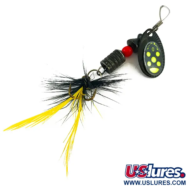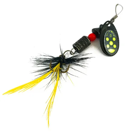 Geltoni taškai, išdėstyti išskirtiniu apskritu raštu ant sodriai juodo lapelio, iškart praneša apie šios South Bend sukriukės kilmę. Šis 5059 modelis, kilęs iš JAV, turi trišakį kabliuką, papuoštą juodų ir geltonų plunksnų mišiniu, suteikiančiu masalui papildomą profilį ir judesį. Masalas sveria 1/8 oz (4 g), o jo bendras ilgis yra 2 1/4" (5,5 cm), todėl jis yra universalus pasirinkimas žvejybai mažuose upeliuose ar ežeruose. Rumbuotas metalinis korpusas ir vienas raudonas karoliukas suteikia reikiamą svorį bei klasikinį vizualinį dirgiklį, būdingą senoviniam amerikietiškam žūklės įrankių dizainui. Juoda lapelio danga ir plunksnos yra gerai išsilaikiusios, todėl šis egzempliorius vertinamas 4/5 būkle. Kiekvienas komponentas, nuo vielos formos iki štampuoto lapelio, atspindi vidurio amžiaus gamybos standartus, kuriuos kolekcininkai sieja su South Bend gaminiais.
