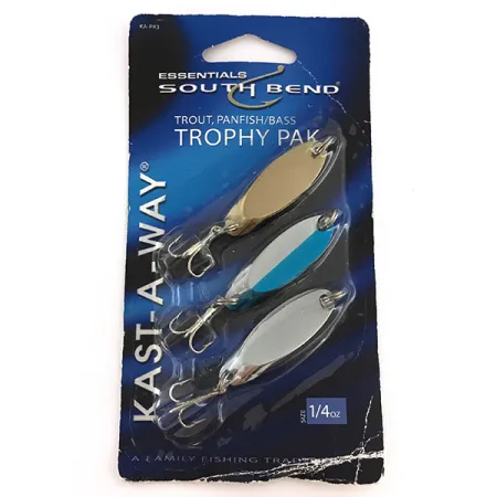 Šios 1/4oz (7g) svorio blisgės priklauso South Bend Essentials linijai, skirtai universaliam naudojimui gėluose vandenyse. Į šį Trophy Pak rinkinį (produkto kodas 8451) įeina trys 1 3/4" (4.5 cm) ilgio masalai. Rinkinį sudaro aukso spalvos blisgė, poliruoto nikelio blisgė ir trečias nikelio variantas su ryškia mėlyna juostele. Pagamintos iš lašo formos metalo profilio ir apginkluotos trišakiais kabliukais, šios blisgės skirtos spiningavimui šalia kliūčių, tokių kaip žolių kraštai ar nuskendę medžiai. Šie konkretūs egzemplioriai yra nenaudoti ir išsaugoti originalioje vintažinėje pakuotėje. South Bend sukūrė šią "Kast-A-Way" seriją kaip patikimą įrankį žvejams, gaudantiems upėtakius, ešerius ir basus. Pakuotėje pateikiami naudingi patarimai, kaip žvejoti tarp povandeninių struktūrų, kur šie masalai yra efektyviausi.